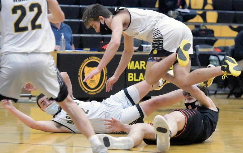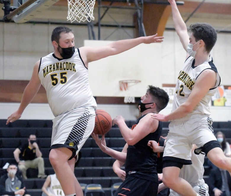 The momentum was short-lived, as Maranacook took off in the second. A Cormier steal and breakaway dunk on the first possession got it started, and after a Collin LePage basket made it 33-24, the Black Bears embarked on an 11-0 run that made it a 20-point game, getting seven points from McClure, two from Worster and two more from Joe Albert (six points).