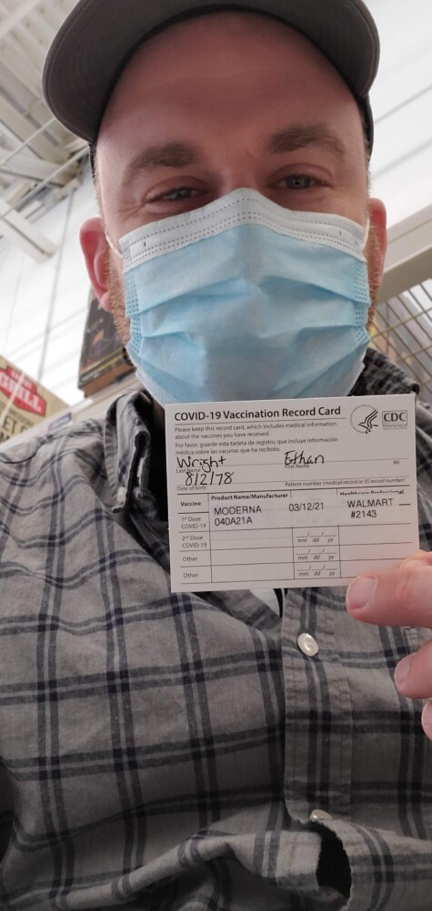 Regional School Unit 9 Director of Choral Music Ethan Wright gets his first COVID-19 vaccination shot recently at the Wal-Mart in Skowhegan. Maine is following President Biden’s directive and allowing all teachers, school staff and childcare providers to get vaccinated. Photo Courtesy of Ethan Wright