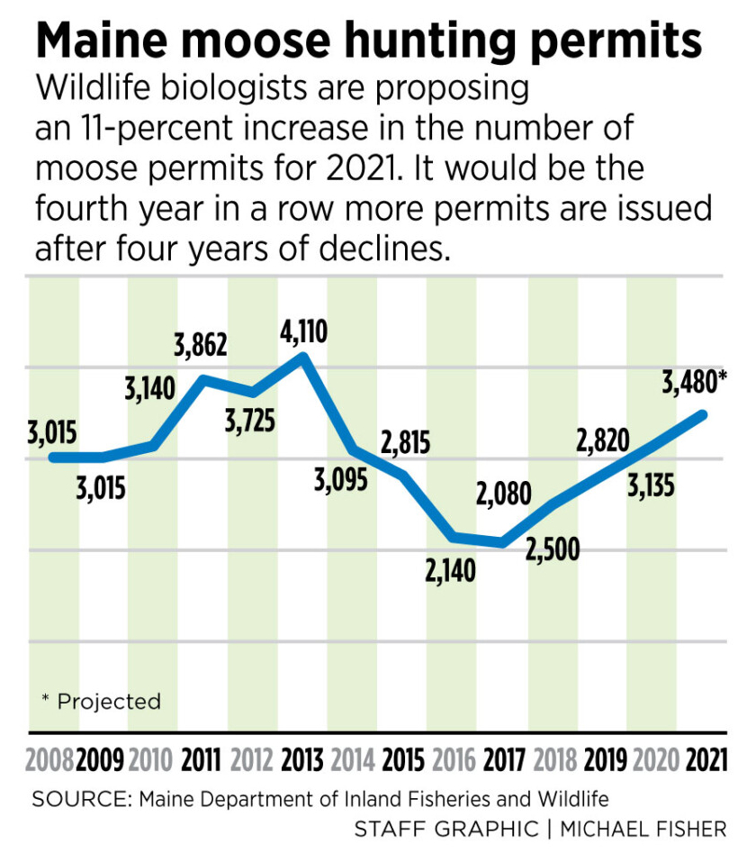 If approved by the state Department of Inland Fisheries and Wildlife’s Advisory Council, the number of annual moose permits will have increased by 67 percent since 2017.