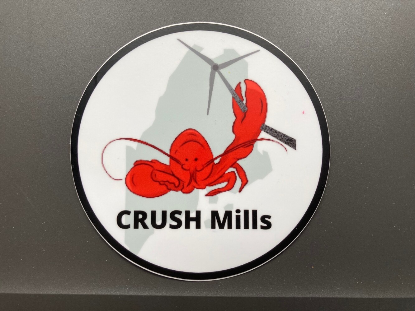 But many fishermen aren’t placated. Some marine businesses have recently begun circulating a sticker that depicts a map of Maine and a red lobster holding a wind turbine in its claw.