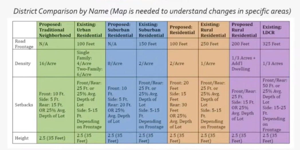 For instance, the urban residential zone, which allows for four single-family homes or six two-family structures per acre, would become “traditional neighborhood,” allowing for a density of 16 units per acre. Setbacks would also be reduced.