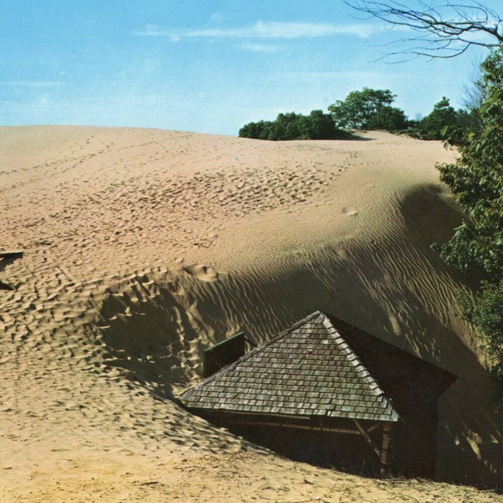 The spring house, which was built in 1938, was partially buried in sand during the desert’s closure through World War II. By 1962, the gazebo-like structure was completely covered.