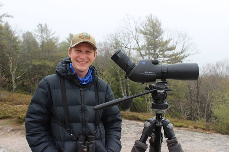 Chances are, if you’ve been atop Bradbury Mountain in Pownal over the past month, you might have seen wildlife biologist Andrew Sharp peering out at the view through his high-powered spotting scope.