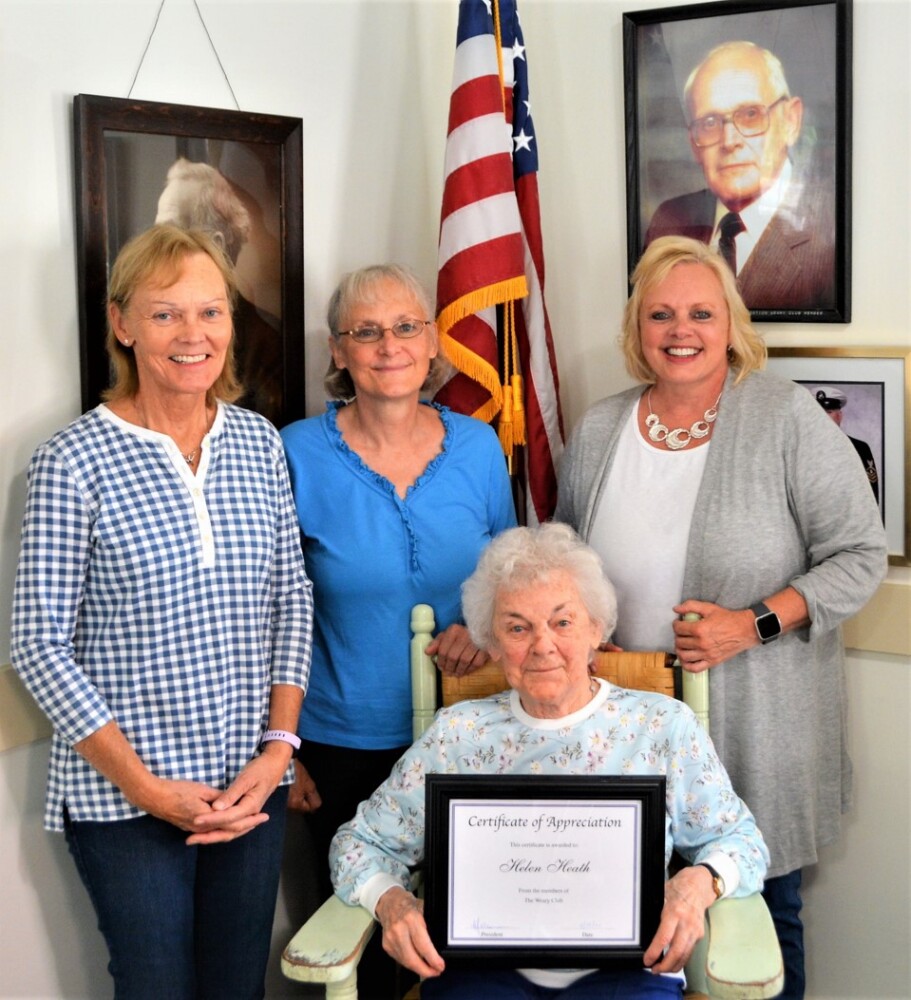 Members gathered for the first monthly coffee in June and Helen was honored with a plaque for her service with her three daughters surrounding her, also members. Upon receiving the plaque, Heath regaled the group with humorous remarks.
