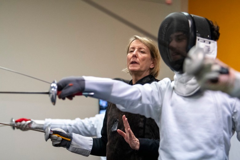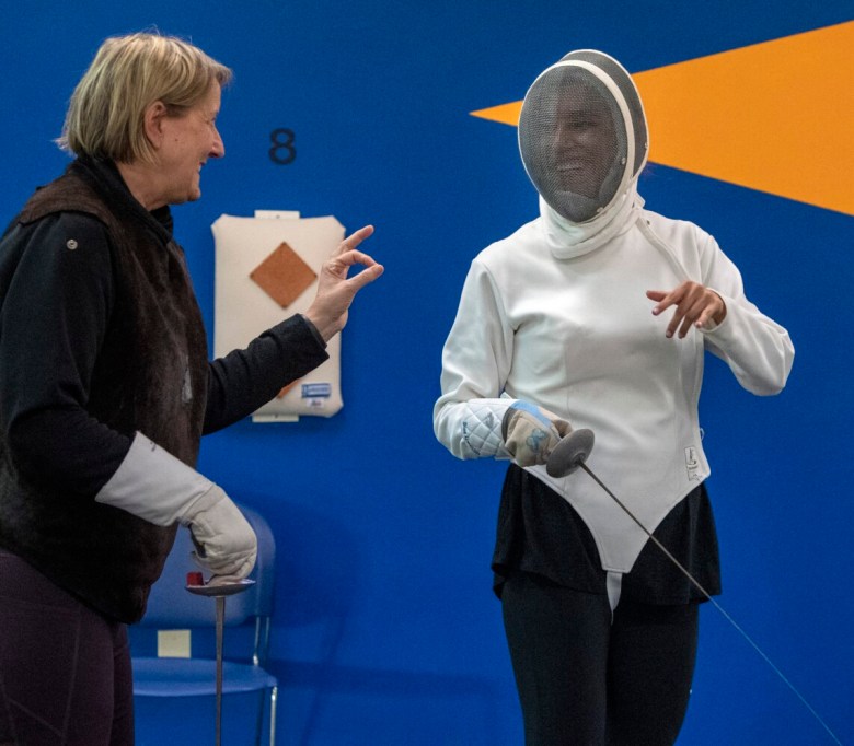 Sara Beck and Charles Melcher are fencing veterans who train at Portland Fencing Center. Beck, 56, said she picked up the sport when she turned 40. She credits the sport with helping her body come back from double hip replacement surgery in 2019.