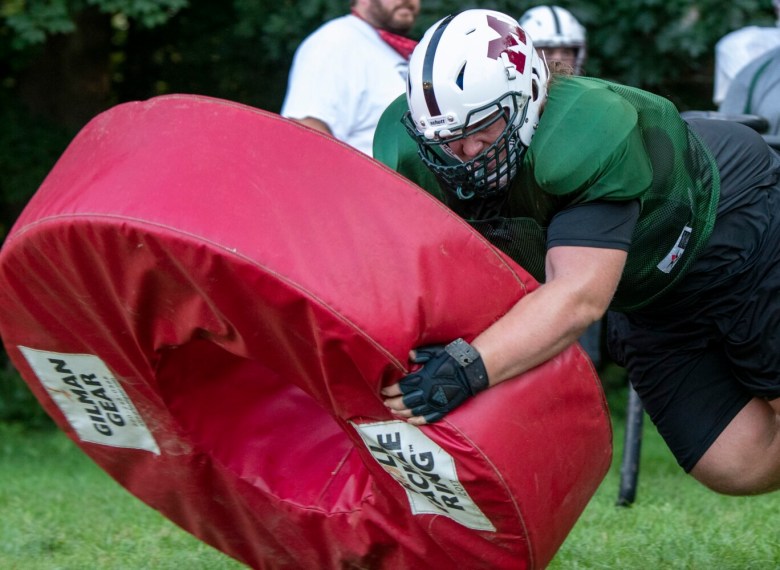 Umberhind is Monmouth’s strong man as the base on stunts, but the sport has also taught him a different type of athleticism. He can do a split and toe-touch, is working on a back handspring, and has gained a flexibility that has served him well on the football field.