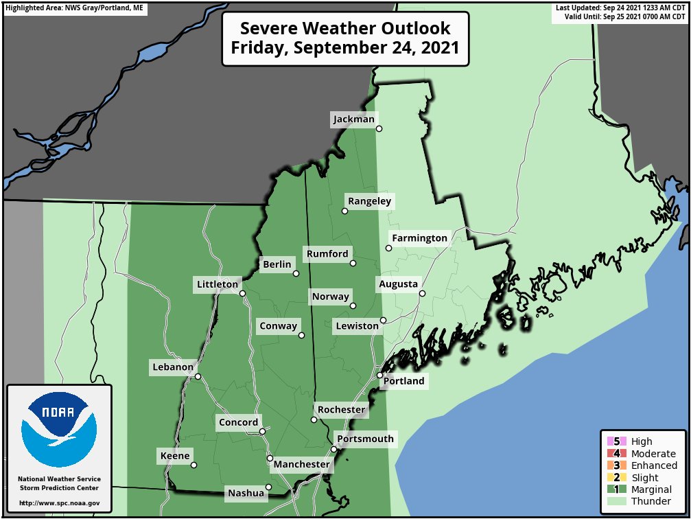 A few thunderstorms could turn strong or severe Friday afternoon. That threat is greatest in far western Maine and New Hampshire. Gusty winds are the main hazard, and a brief tornado cannot be ruled out.