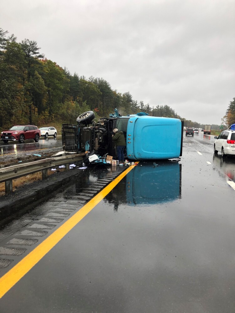 Maine State Police said the tractor-trailer crashed on the turnpike around 10:15 a.m. Wednesday during driving rain and gusty winds. Southbound traffic was backed up for six miles. State police said the truck, which was traveling northbound, crashed into the median and crossed into the southbound lane before landing on its side. It was not clear whether anyone was injured.