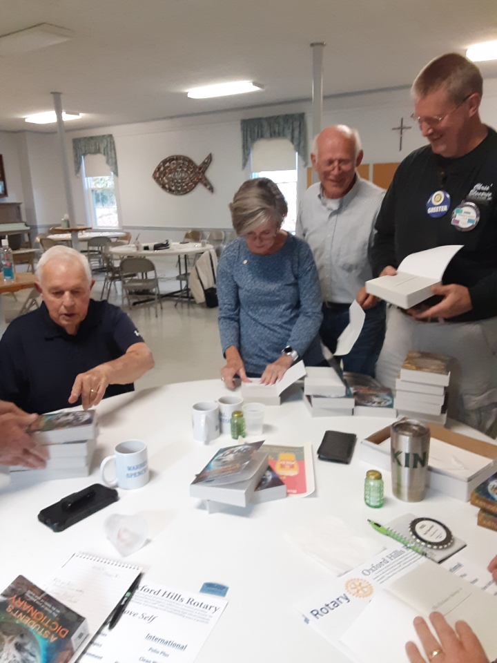 PARIS — The Rotary Club of Oxford Hills members recently spent a weekly meeting prepping 211 dictionaries to give out to all 3rd graders in SAD 17. This is the 18th year OH Rotary has been distributing dictionaries, and a few years ago, the Club renamed the Dictionary Project in honor of Mary Lou Burns, a long-time teacher and administrator in SAD 17 and a Rotarian for many years, who was instrumental in starting this project along with Past President Royal Earle back in 2004. To date, the club has distributed 4,704.