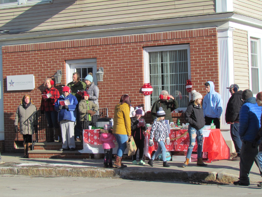 NEW VINEYARD — Saturday was Chester Greenwood Day in Farmington. Adding to the festivities for spectators gathering along Main Street in anticipation of the annual parade was a group of carolers from Gospel Light Baptist Church. Under the direction of Sue Jones, the group merrily sang all the traditional Christmas favorites, encouraging those nearby to sing along, as well.