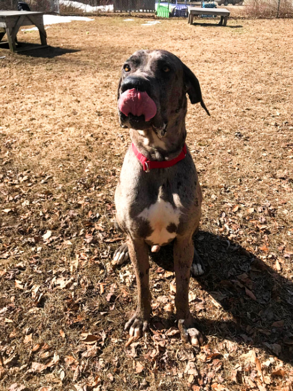 Rex is a male Great Dane, four to six years old: Meet Rex! Rex is a loving and outgoing guy with a personality to match his stature. He loves to play tug of war and chase after sticks (or small trees) and going for walks in the woods. Rex has decent leash manners and a willing personality! Due to his size and exuberance, we think he would be best suited to a home with Dane experience and without small children. Rex is also good with cats! Rex can be dog selective and isn’t good with other male dogs.