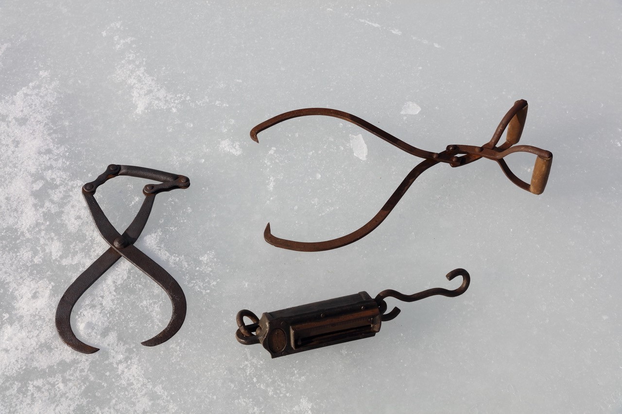 A big part of Aho’s passion for this project is his fascination with ice harvesting and the role it plays in his own art. He grew up in Hudson, New Hampshire, hearing stories from his father about ice harvests. As a child, his father had worked on ice harvests during the Great Depression of the 1930s with other Finnish immigrants in the small town of Townsend, Massachusetts. Over the years, Aho has amassed a collection of ice harvesting tools – including a saw that dates to 1890 and a scale and some tongs he inherited from his father.