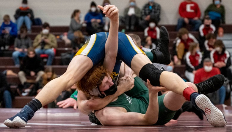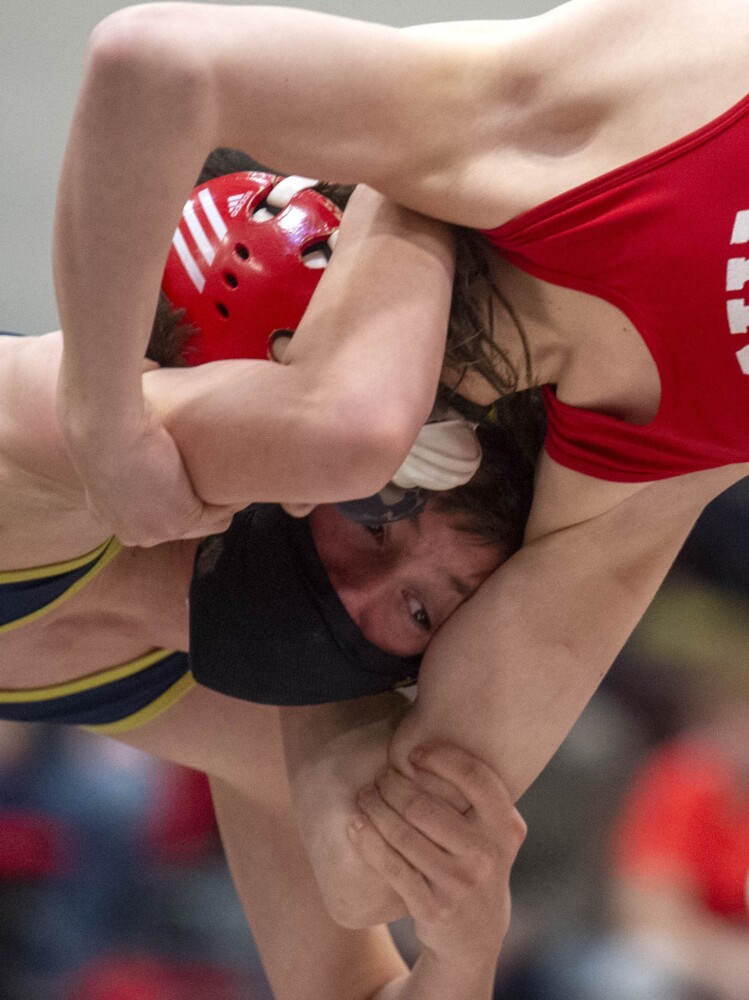 Other individual champions included Cony’s Devin Geroux (pin, 106 pounds) and Jonny Lettre (withdrawal due to injury, 220), Skowhegan’s Aiden Clark (pin, 145) and Kobe Butters (5-3, 285), Camden Hills’ Julian Henderson (pin, 120) and Henry Pharris (11-4, 182), Windham/Gray-New Gloucester/Westbrook’s Ayden Cofone (pin, 113) and Mt. Blue’s Stephen Galkowski (pin, 138). Galkowski’s win came 3:06 into the match after Oxford Hills’ Hunter Wormwood slipped out of two potential pins, and gave the freshman a victory in his first regional final.