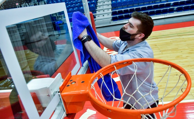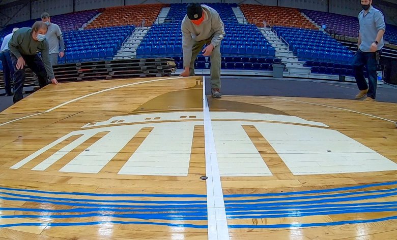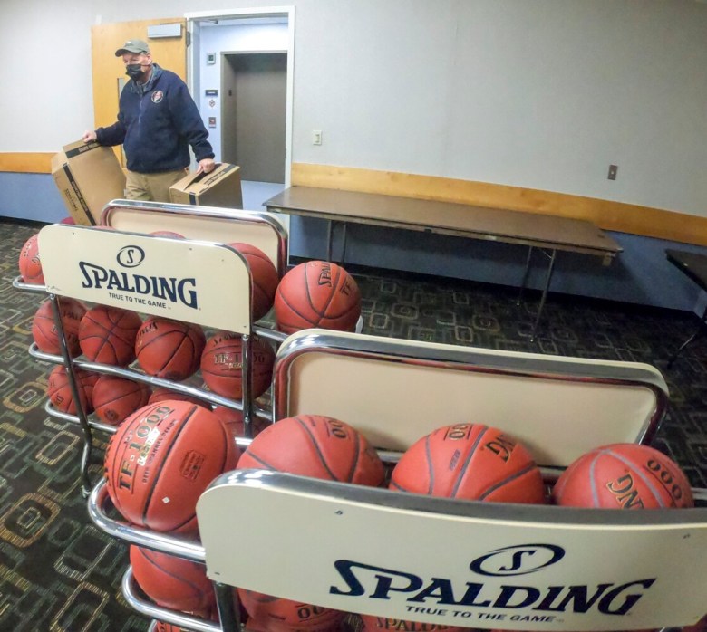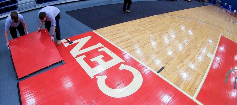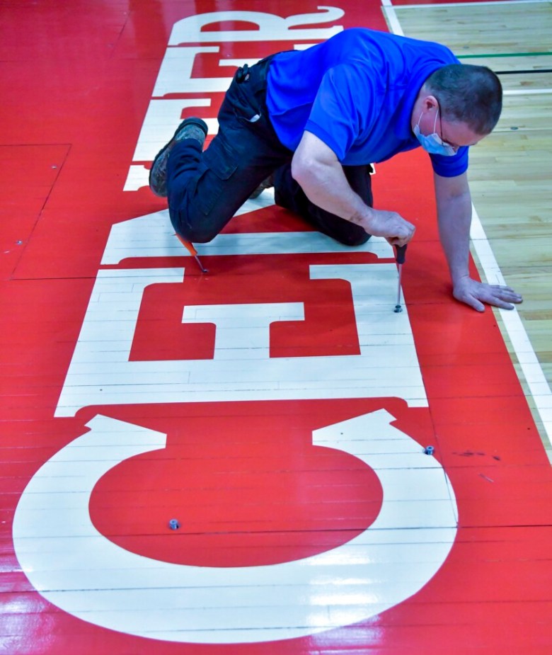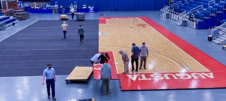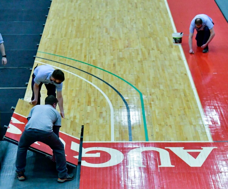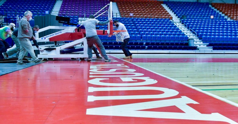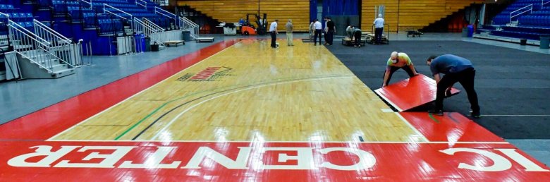 A crew from the city’s Bureau of Parks & Recreation joined Augusta Civic Center employees Tuesday in putting in the floor, pulling out bleachers and installing guardrails to get ready for the landmark tournament, which is organized by the Maine Principals’ Association.