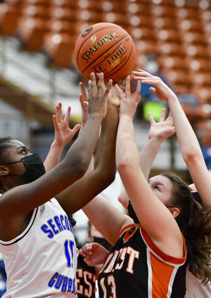 Forest Hills charged out to an 8-3 led in the first quarter thanks to five points from Grace Allen — her only points on the day — but Seacoast Christian roared back with an 8-0 run. Bella Gee, who once was accidentally left behind after a practice, prompting the addition of a “Where’s Bella?” sign on the Civic Center wall — started the rally with a basket with 1:50 left in the period. The Guardians continued the run with a Leech layup off her own steal and a Winship bucket following a Tiger turnover.