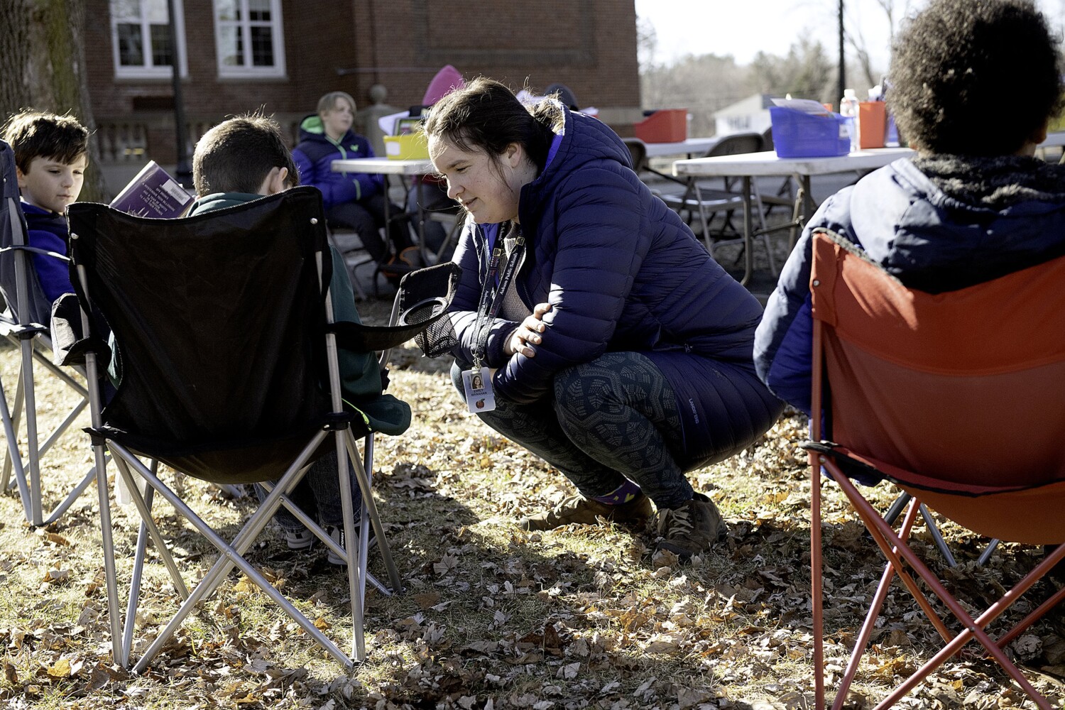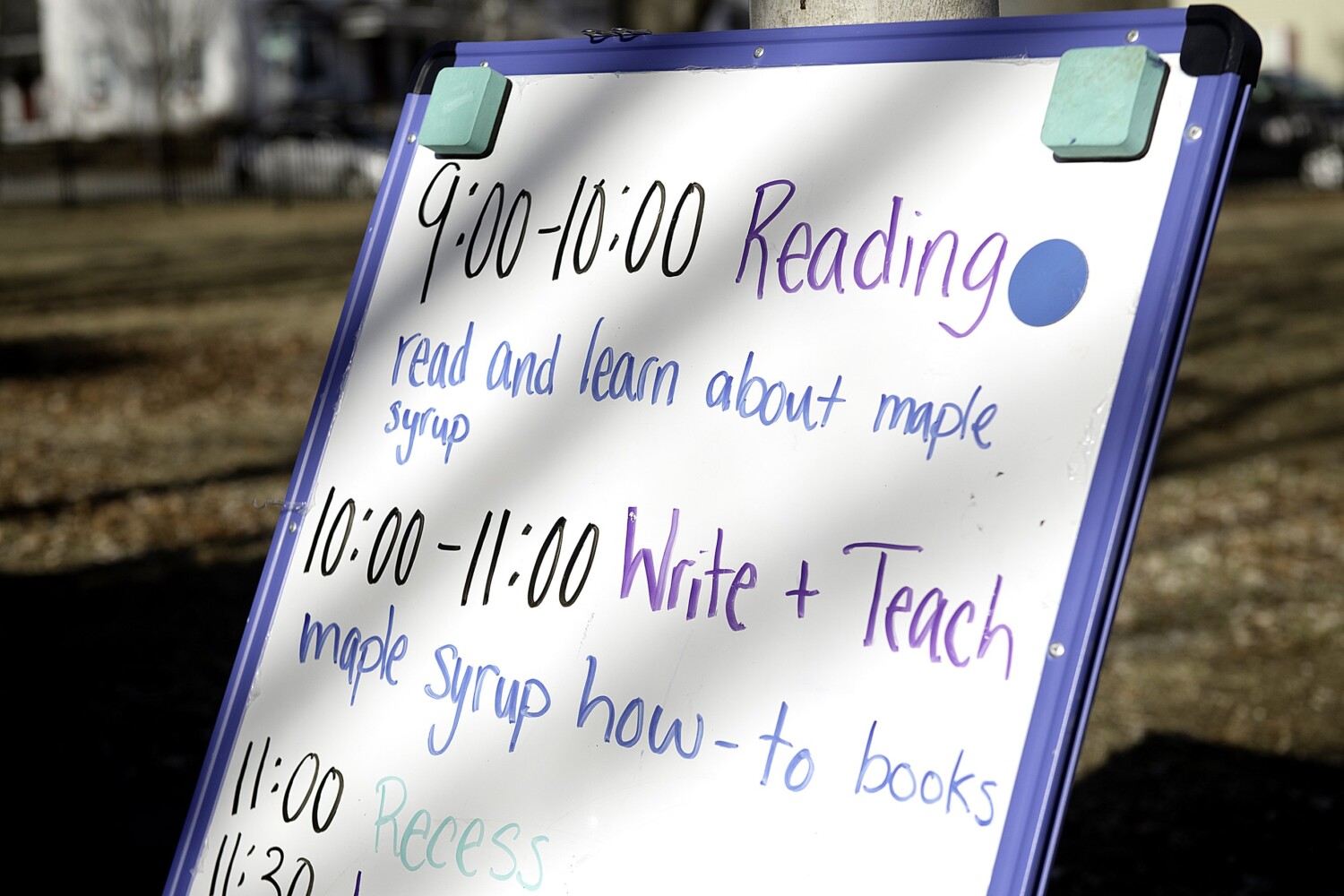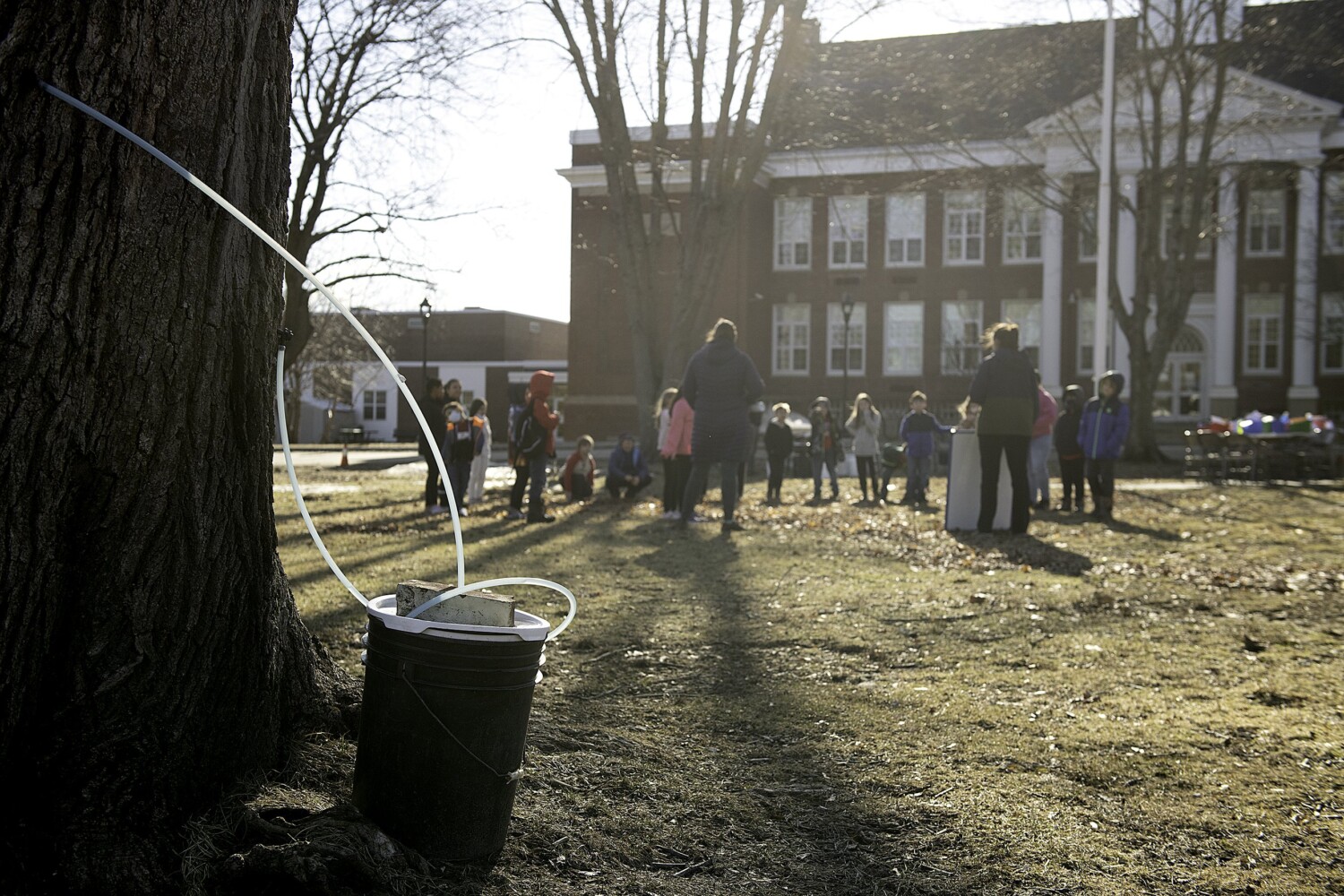 Oakland Vallieres, center, records information with his iPad on Monday while third grade teacher Tara Knight pulls a tap from a maple tree at Walton Elementary School in Auburn. The classroom was moved outside, and teachers designed their lessons around the maple syrup making process. Students tapped four maple trees on the school’s front lawn and collected the sap for Ben Lavigne of Auburn to boil down into syrup. The students shared over a gallon of maple syrup at the end of the day. They will use the information they gathered Monday to make a book on their iPads. Daryn Slover/Sun JournalBen Lavigne shows students a pan of maple sap he is boiling down to make maple syrup Monday at Walton Elementary School in Auburn. Third grade students’ classroom moved outside and teachers designed their lessons around the syrup making process. Students tapped four maple trees on the school’s front lawn and collected the sap for Lavigne to boil down. The students shared over a gallon of maple syrup at the end of the day. They will use the information they gathered Monday to make a book on their iPads. Daryn Slover/Sun JournalOakland Vallieres reads his worksheet about making maple syrup Monday at Walton Elementary School in Auburn. Vallieres is a student in Emily Manahan-Makley’s classroom. Daryn Slover/Sun JournalThird-graders Emberland Vallieres, left, Cameron Goldrup, center, and Oakland Vallieres answer their worksheets about making maple syrup Monday at Walton Elementary School in Auburn. Daryn Slover/Sun JournalJaxon Mitchell, right, and Emberland Vallieres use their iPads Monday to create a book about the process of making maple syrup at Walton Elementary School in Auburn. Third grade students’ classroom moved outside and their teachers designed their lessons around the syrup making process. Students tapped four maple trees on the school’s front lawn and collected the sap for Ben Lavigne of Auburn to boil down. The students shared over a gallon of maple syrup at the end of the day and will use the information they gathered Monday to make a book. Daryn Slover/Sun JournalThird grade teacher Emily Manahan-Makley talks with her students Monday about the process of making maple syrup at Walton Elementary School in Auburn. Makley and Tara Knight moved their classrooms outside for the day to teach about making maple syrup. Daryn Slover/Sun JournalBen Lavigne of Auburn boils maple sap Monday on the front lawn of Walton Elementary School in Auburn. Lavigne arrived at the school at 5 a.m. so students would have maple syrup to take home by the end of the day. Daryn Slover/Sun JournalThird grade teachers Tara Knight and Emily Manahan-Makley designed their Monday lessons around the maple syrup making process at Walton Elementary School in Auburn. Daryn Slover/Sun JournalThird grade students tap large maple trees Monday on the front lawn of Walton Elementary School in Auburn. It’s an annual tradition. Daryn Slover/Sun Journal