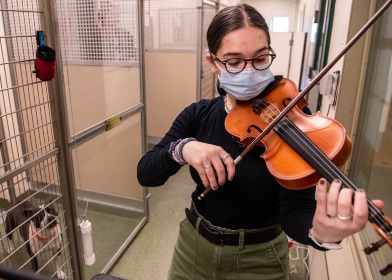 Maddy Ewell and Riley Gramley filed into a narrow corridor, led by operations manager Ken Schlichting, their violin cases, stands, and sheet music in hand, and set themselves up before a row of dogs poking their noses through their cages. Cutting through the barrage of barking was “6 Violin Duos” by the Austrian-French composer Ignaz Pleyel, followed by scattered whines and wide eyes.