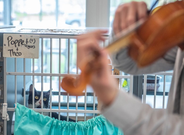 The duo played in the dog and cat rooms, the latter in an open space where a member of the audience was allowed to roam free for a bit. The cats looked on from inside their cages, at ease as one is at a symphony, and their eyes followed the rising and falling of the violin bows.