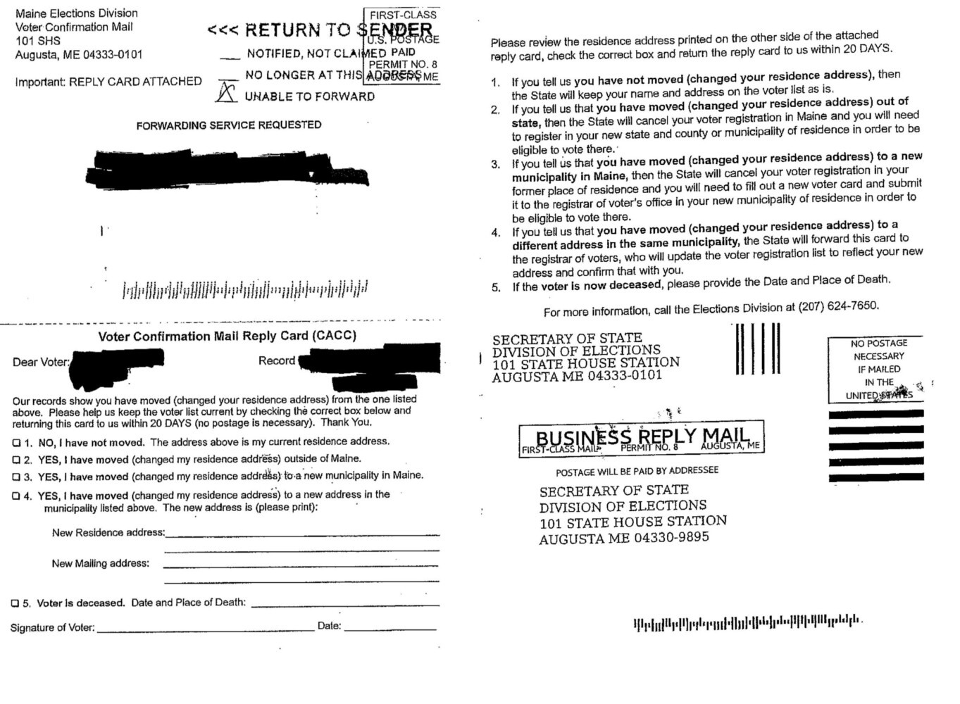 The mailing is part of Maine’s routine maintenance of its voter lists under the National Voter Registration Act, and it will help election officials clean up the list by determining whether people live at the address where they registered to vote. As of this month, there are more than 1.1 million registered voters in Maine.