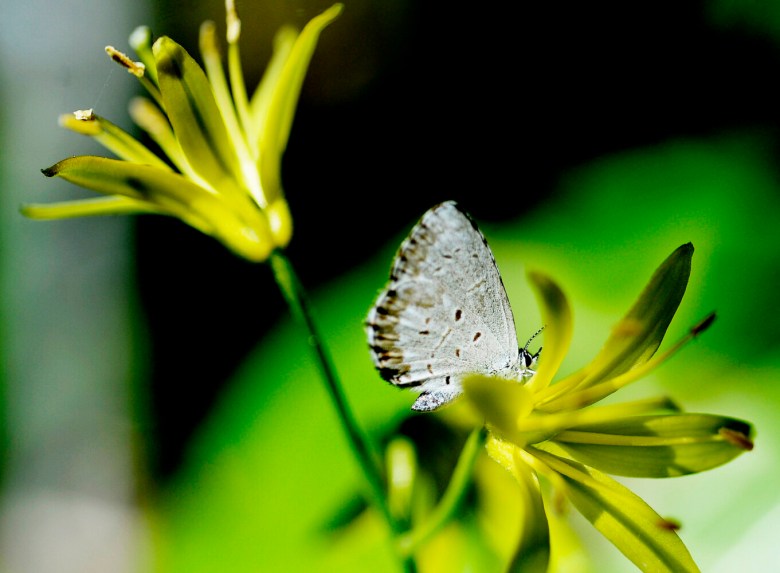An azure butterfly pollinates a yellow clintonia spotted during a flower walk at Walden Park Preserve in Bangor.