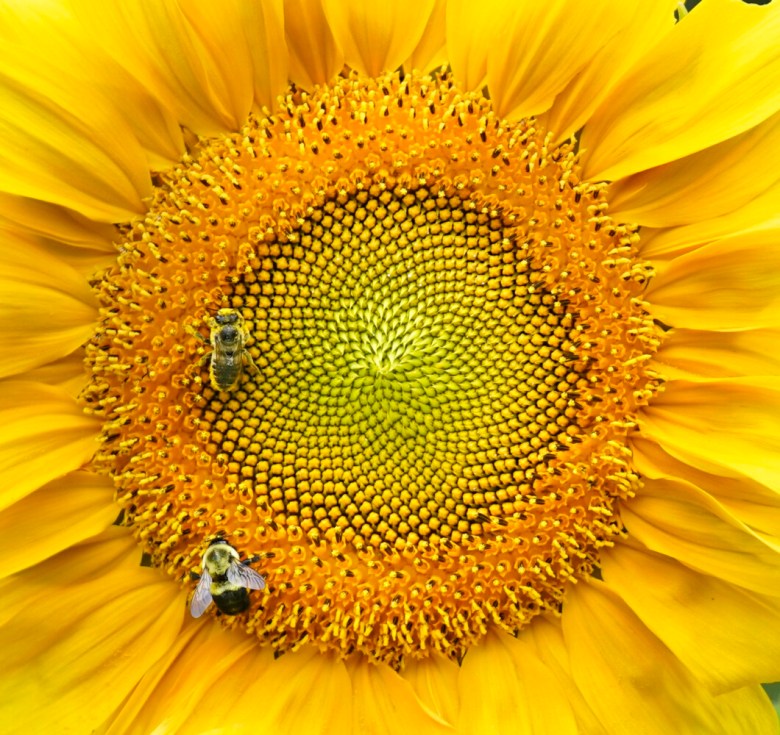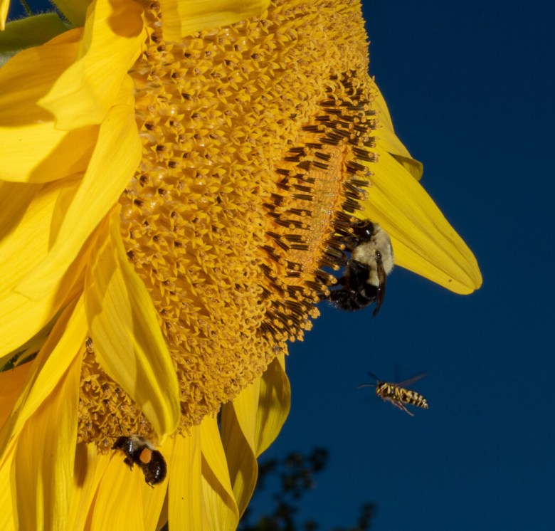 Bees collect pollen from a sunflower in a garden on Mill Street in Auburn.
