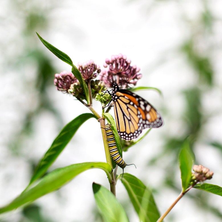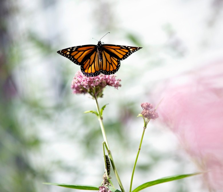 Patricia Cluff has created ever expanding waystations for Monarchs at her home in North Berwick. A Monarch butterfly lands on swamp milkweed next to a Monarch caterpillar.