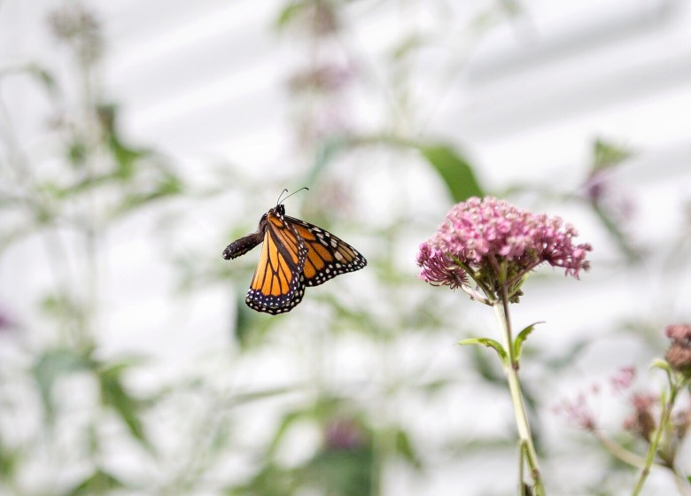NORTH BERWICK, ME - JULY 25: Patricia Cluff has created ever expanding waystations for Monarch butterflies at her home in North Berwick. A Monarch butterfly flies to a landing spot in Cluffís swamp milkweed. (Staff photo by Derek Davis/Staff Photographer)