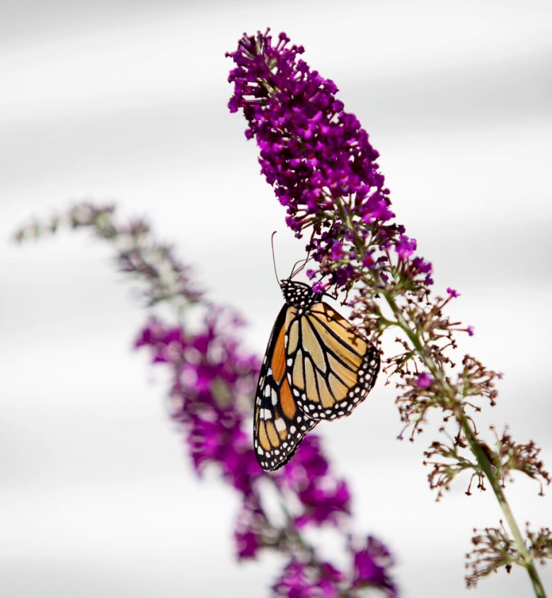 GARDINER, ME - AUGUST 9: A Monarch Butterfly extends Monday August 9, 2021 a proboscis to suck pollen from a plant on the Gardiner waterfront along the Kennebec River. Flower beds abutting the river that are cultivated by the volunteer brigade of Gardiner Gardners have become a natural magnet for bees, butterflies and hummingbirds as the plants have blossomed. Andy Molloy/Kennebec Journal