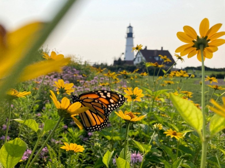 A monarch butterfly feeds on flowers in front of Portland Head Light at Fort Williams Park in late July 2021.