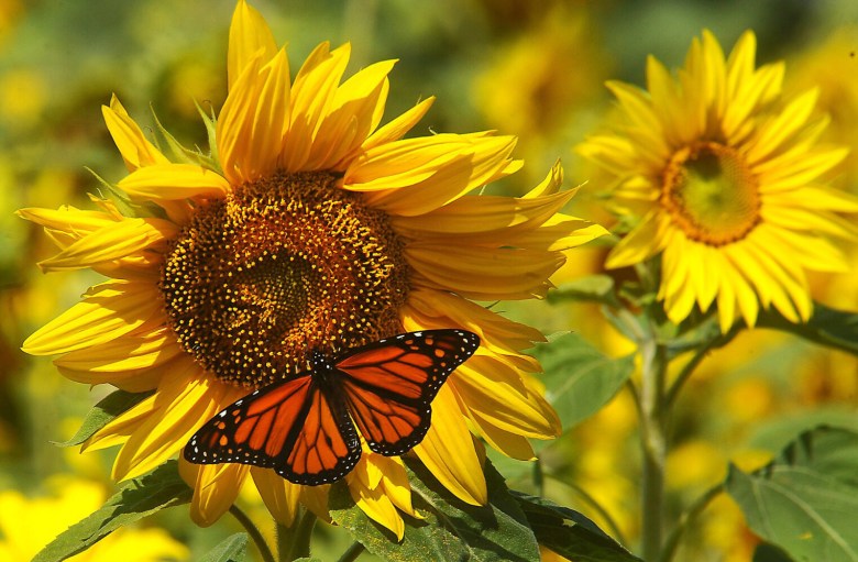 3353# 01butterlfy BENTON, MAINE SEPTEMBER 10, 2020, A butterfly is shown with sunflowers in Benton, Maine Thursday September 10, 2020. (Staff photo by Rich Abrahamson/Morning Sentinel.