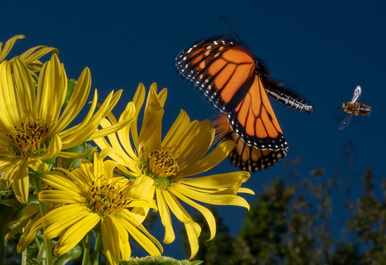 A monarch butterfly collects pollen from a flower in a garden on Mill Street in Auburn Thursday afternoon.