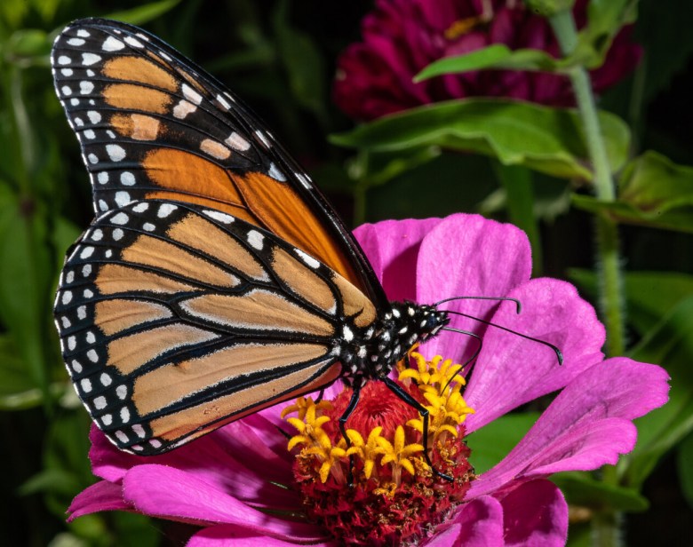 A monarch butterfly collects pollen from a flower in a garden in Auburn.