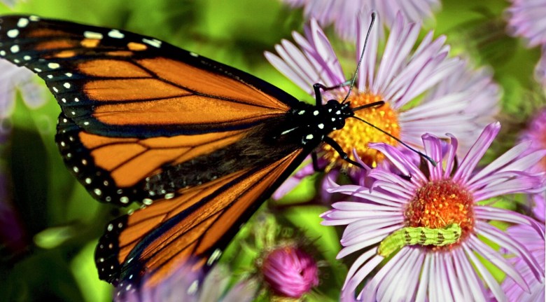 A catepillar and monarch butterfly sit on a wild aster on Tuesday morning in Manchester. It and several bees were buzzing around the pink flowers along Route 202.