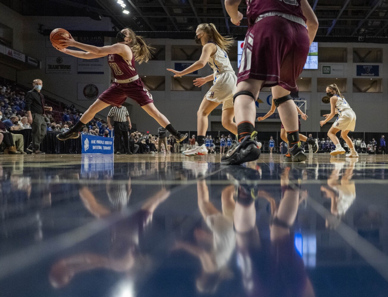 Maine Central Institute’s Adrianna Brooks (10) leaps for the inbound ball against Hermon High School’s in the Class B North quarterfinals Maine Principals Association basketball tournament at the Cross Insurance Center in Bangor on Friday, Feb. 18, 2022.