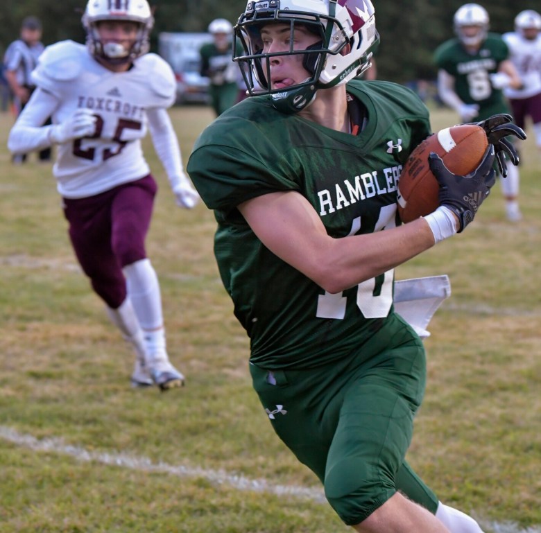 In the third quarter and the Ramblers trailing 14-13 after Marsters’ 52-yard TD run and extra point, Harding struck again. On third-and-16 from his own 13-yard line, he fired a long ball toward wideout Nick Keezer, who beat out Foxcroft defensive back Richard and galloped 87 yards toward the end zone and made it a 21-14 game following a Harding-to-Stubbert 2-point conversion.