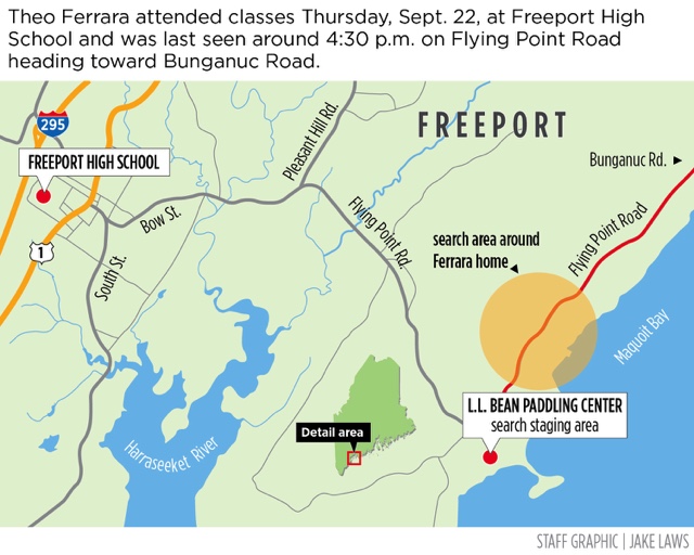 A team of about 50 police officers, game wardens and trained volunteers have combed about 7 square miles around Flying Point Road where Theo Ferrara was last seen walking toward Brunswick by a passing driver.