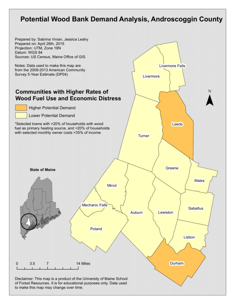 A demand analysis conducted by Vivian and Leahy in 2015 found that residents near Farmington, Rangeley, Buckfield, Canton, Stoneham and Brownfield might find wood banks to be particularly beneficial. The analysis considered income levels and the number of homes heated by wood using census data.