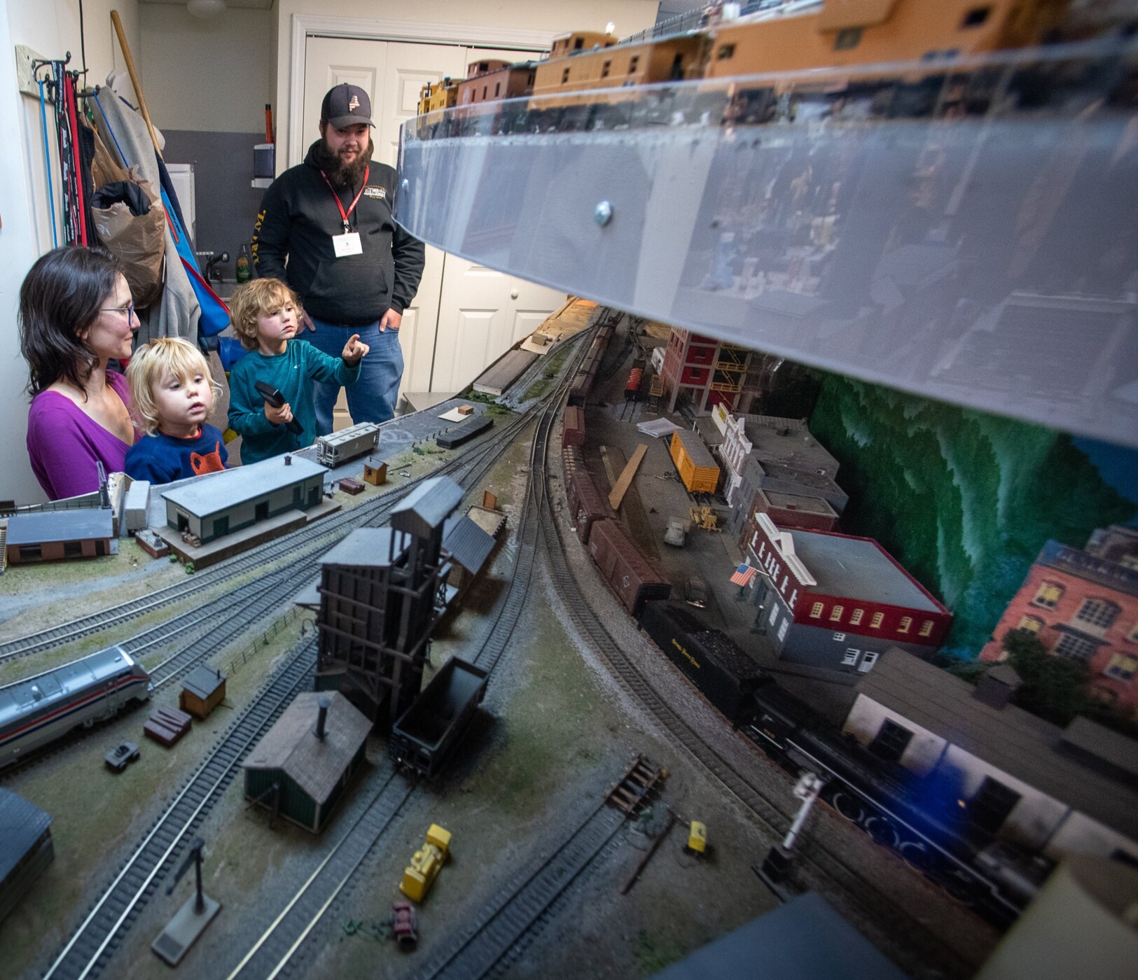 Great Falls Model Railroad Club member Bob Willard works on another piece for one of the club’s layouts Sunday afternoon during ExTRAINaganza. Russ Dillingham/Sun JournalElliot Boss points to a train while his father, Sam, holds him during Sunday’s ExTRAINaganza at Great Galls Model Railroad Club in Auburn. The open house continues next Friday, Saturday and Sunday. Russ Dillingham/Sun JournalRoger Plummer, who is a longtime real railroad worker at St. Lawrence & Atlantic Railroad, puts the Polar Express back on the track Sunday during the Great Falls Model Railroad Club’s annual open house. ExTRAINaganza continues next Friday, Saturday and Sunday. Russ Dillingham/Sun JournalDan Makowski, from Great Falls Model Railroad Club, right, watches Sunday afternoon as John Piwowarski points to the train he was controlling at the Auburn clubhouse duirng ExTRAINaganza. To his left: His mother, Annie Baron, holding his brother, Arthur Piwowarski. Russ Dillingham/Sun JournalA signalman waves at a coming train as another comes around the bend during Sunday’s ExTRAINaganza at Great Falls Model Railroad Club in Auburn. Russ Dillingham/Sun JournalWill O’Shea points out to his favorite, “Percy” the train, on Sunday afternoon as it chugs past as his mother, Katie, holds him at the Great Falls Model Railroad Club during ExTRAINaganza, the club’s annual open house. The family is from Rhode Island, visiting relatives in Livermore. Russ Dillingham/Sun JournalGreat Falls Model Railroad Club member Dick Clark, back, watches as Blake Cole of Auburn checks out a train coming around the bend Sunday afternoon during ExTRAINaganza. Russ Dillingham/Sun Journal