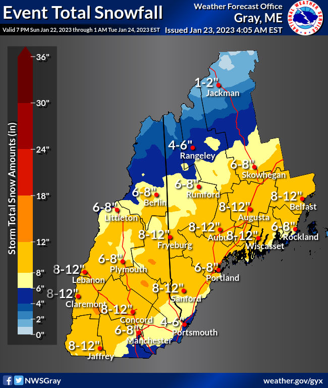 Rain and sleet is mixing in across far southern areas and parts of the immediate coastline, but elsewhere snow continues to fall. Everyone is expected to change back to snow by late morning and the early afternoon, with many locations expected to pick up 8-12 inches from this system. National Weather Service graphic