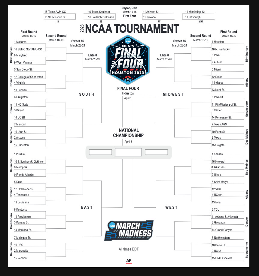 The tournament begins Tuesday with two First Four games. The full madness starts Thursday with the first round, with 16 games, then 16 more the next day.