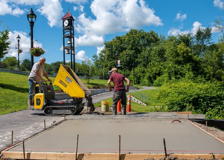 Ben Brown, right, pulls concrete Wednesday morning from a track dumper driven by John Michaud of Michaud Concrete in Minot. They were laying the base for a kayak rack along the shore of the Little Androscoggin River behind Anniversary Park in Auburn. According to Liz Allen, Auburn’s director of communications and community engagement, the pad will house a self-service kayak rental kiosk with eight kayaks, complete with life jackets and paddles available for rent through the “rent.fun” app. Rentals will be $15 for the first hour and 30 cents per minute after that. Russ Dillingham/Sun JournalJohn Michaud of Michaud Concrete in Minot drives a track dumper full of concrete Wednesday afternoon that his company was using to construct a kayak rack along the shore of the Little Androscoggin River behind Anniversary Park in Auburn. According to Liz Allen, Auburn’s director of communications and community engagement, the pad will house a self-service kayak rental kiosk with eight kayaks, complete with life jackets and paddles available for rent through the “rent.fun” app. Rentals will be $15 for the first hour and 30 cents per minute after that. Russ Dillingham/Sun Journal