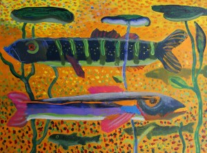 “I thought of fish and how I could make them show some of our human tendencies and behaviors.” During his last Artist of the Month showing he focused on fishing based on memories of going out with his Dad when he was a kid.