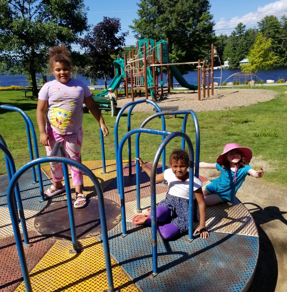 Bel-Rose Augustin, 8, of Phillips, left, her sister Lily, 6, center, with friend Annabel Hopkins, 6, of Jay ride the merry-go-round Tuesday at a Wilton park. The girls met at the playground and joined together for the ride. Donna M. Perry/Sun Journal