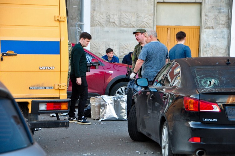 Investigators work at the site of the place where a downed Ukrainian drone fell in Krasnogorsk, just outside Moscow, Russia, on Tuesday. Andrei Vorobyov, the governor of the Moscow region, said that two Ukrainian drones were shot down by air defenses on the western outskirts of the Russian capital early Tuesday. Moscow News Agency via Associated Press
