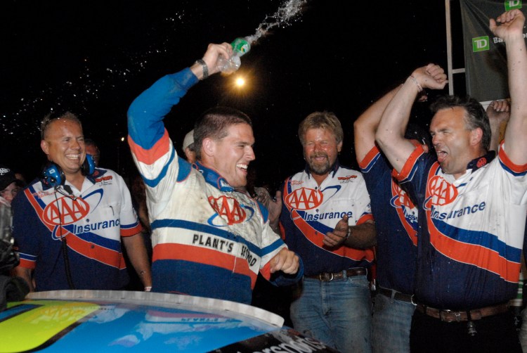 Jeremie Worff, second from left, and his crew celebrate after Worff won the Oxford 250 in July 2006. Whorff’s dad, Bill, placed second. Shawn Patrick Ouellette/Press Herald file photo