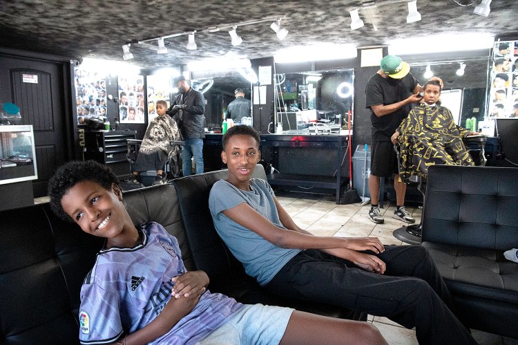 Imraan Mohamed, left, and Amin Sahal wait Tuesday to get their haircut at 207 Barbershop in Lewiston. Mohamed, a sixth grader at Robert V. Connors Elementary School in Lewiston, and Sahal, a junior at Lewiston High School, both stopped in to get their back-to-school haircuts before the first day of school. “All week back-to-school haircuts is what we have been doing,” Tyrone Jones says as he cuts Mohamud Sahar’s hair, at right. Sahar, a fifth grader at Thomas J. McMahon Elementary School, and his cousin, Abdirisak Shugri, back left, also came to get a trim before school starts. The first day of school for Lewiston and Auburn public schools is Wednesday. Daryn Slover/Sun Journal