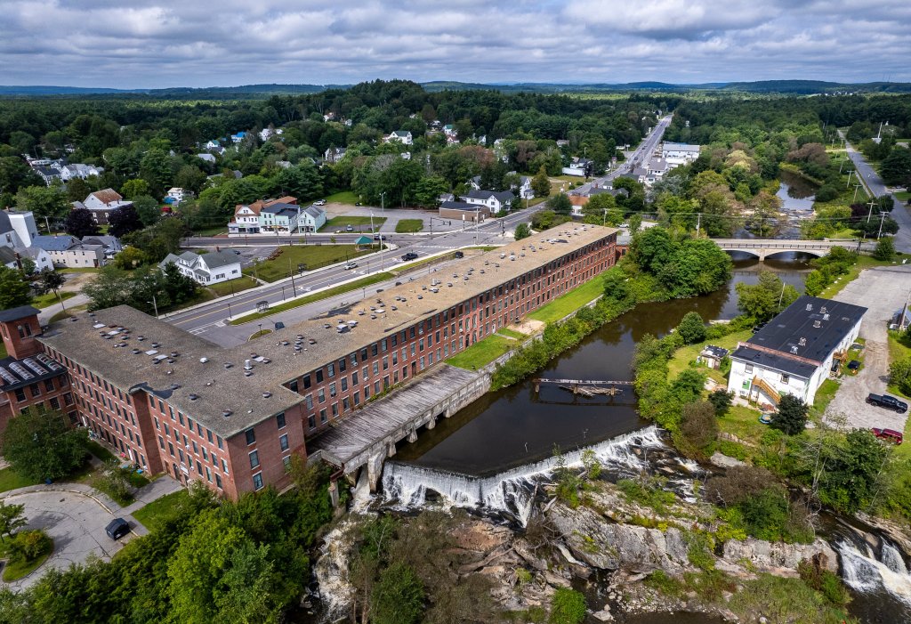 The Sabattus River cascades over a dam Tuesday morning behind the Farwell Mill off Route 196 in Lisbon. The Upper Town Dam that was just beyond the Webster Road Bridge, middle right, was removed last year. Conservationists are aiming to remove or construct fish ladders over the five remaining dams on the river in the next several years, opening access to 75 miles of river and stream habitat for migrating fish, especially alewives. According to Casey Clark, marine scientist at the Maine Department of Marine Resources, “Design plans for partial removal of the Farwell Dam and construction of a nature-like fishway will be complete in October of this year. Once plans are complete, we intend to share them with town leadership and have a meeting in Lisbon for the public to review the plans and provide comments. The department has secured about half of the funding needed and is actively working to secure the remaining funding to complete the project. We aim to complete the project in 2024 to meet our funding requirements,” Clark said. Russ Dillingham/Sun Journal