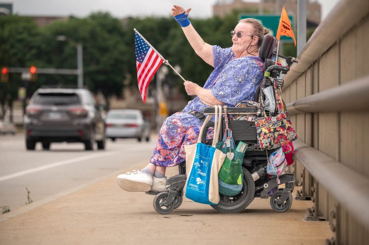 Martha Ford of Lewiston waves to passing motorists Monday on the Gov. James B. Longley Memorial Bridge spanning the Androscoggin River between Lewiston and Auburn. Ford’s late husband, John, used to come out and wave a flag every Sept. 11 since the terrorist attacks in 2001 to urge people to never forget those who lost their lives in New York City, the Pentagon in Washington, Virginia, and Shanksville, Pennsylvania. Ford said she remembers more honking when her husband waved the flag, but she did say that a passerby stopped to thank her for being there and gave her a package of chocolate mint cookies. Andree Kehn/Sun Journal