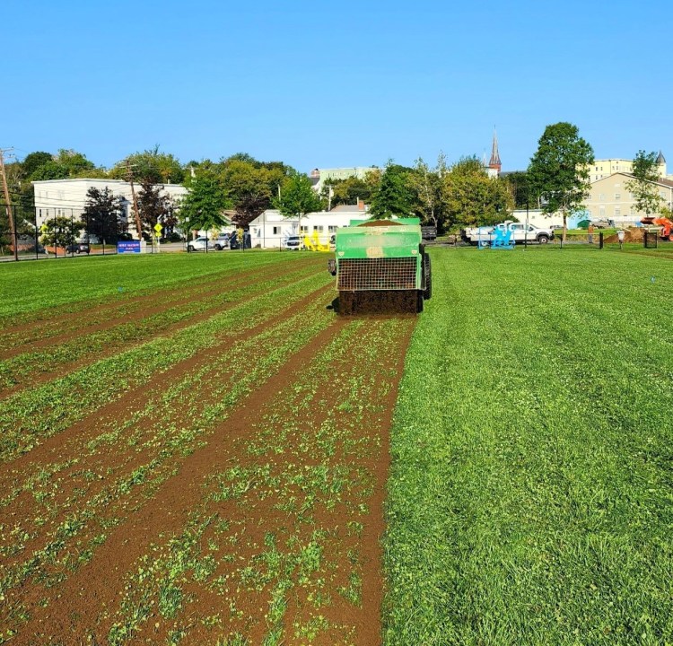 A thin layer of loam is applied Friday to the 1.5-acre Auburn Savings Recreation Field in Mike McGraw Park at 280 Bartlett St. in Lewiston to improve turf quality, field playability and safety. The field will reopen in about three weeks, weather permitting, after seeds have germinated and roots are established, Megan Bates, Public Works deputy director of highway/open spaces, said. “The work being done will result in marked improvements, and we appreciate residents’ patience during the field closure,” she said. Submitted photo