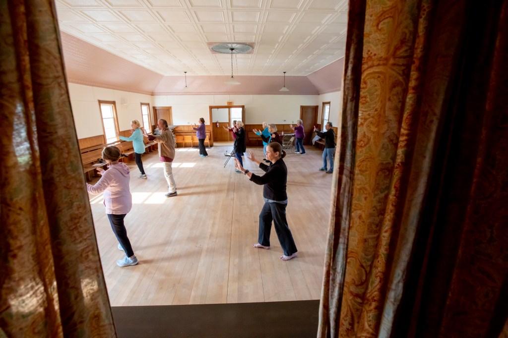 Karen Reilly of Newry, far left, teaches tai chi Wednesday morning at the Bear River Grange Hall in Newry. Tai chi was developed in China and is a form of exercise or martial art characterized by slow, rhythmic, circular movements. Rose Lincoln/The Bethel Citizen